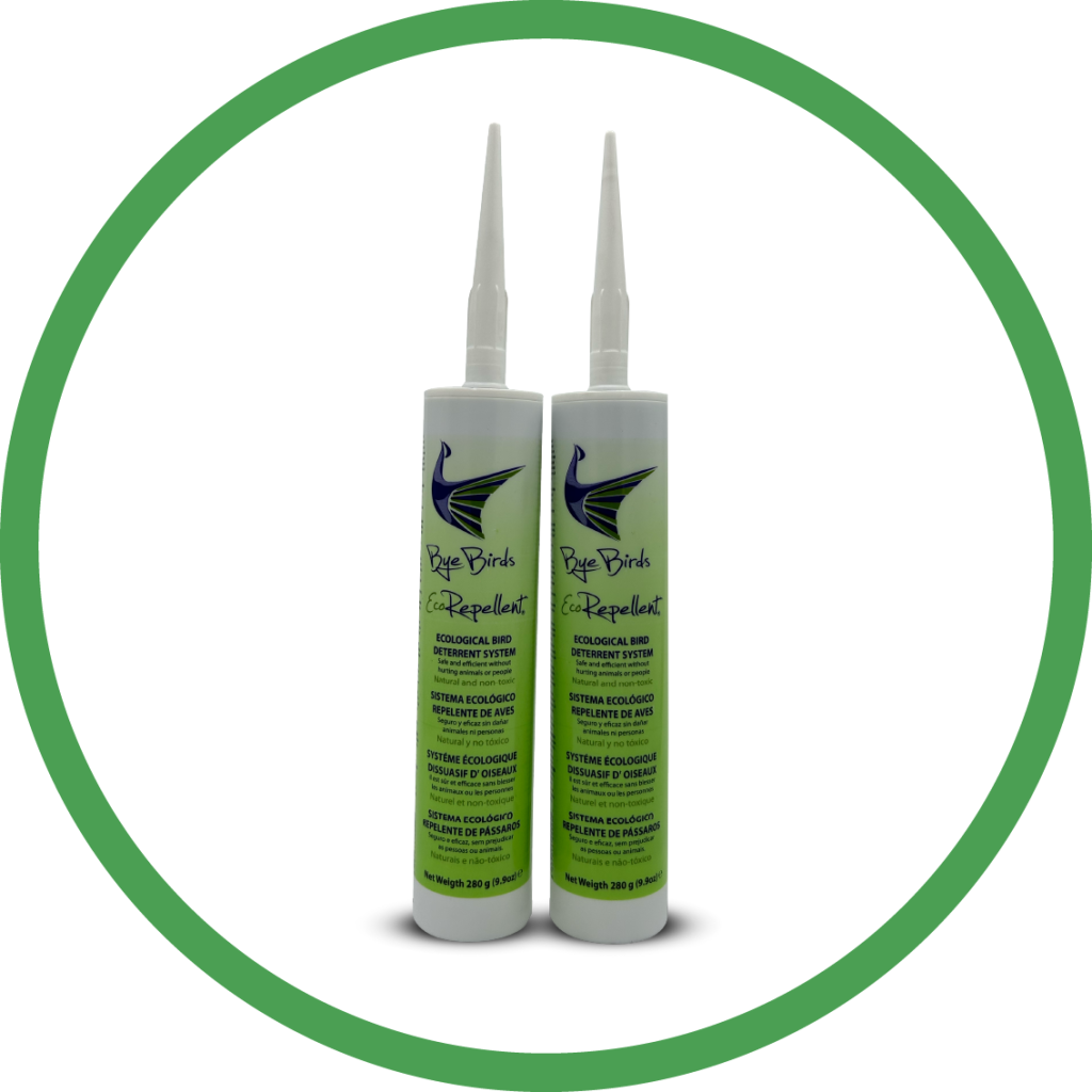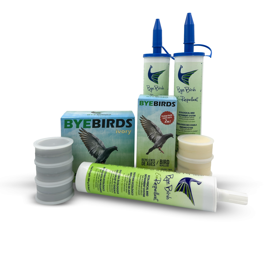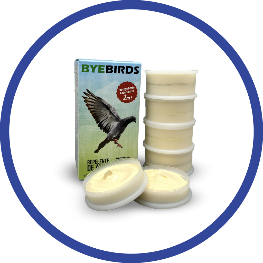 ByeBirds es una pasta que se queda impregnada temporalmente en las plumas de los pájaros, incomodando su vuelo. Disuade las aves por olor, tacto y gusto. Las aves lo perciben rápidamente por medio del olor y la vista.